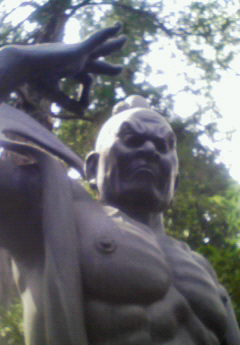 仲見世で、もう今では有名になってしまったが、歩くランドマークおじじに遭遇。犬神サーカス団的ラメいり袴で頭には大きな鉢なんぞを乗せ、塩沢とき的眼鏡で髭をたくわえて、堂々と街を歩くおじじだ。観光客から写真を頼まれておった。アチキは目撃数度目なのだが、おじじは、イヤリングを新装身具として装着しておった。そのイヤリングとは、ビーカーで、中に水を入れ、金魚を泳がしておる、ちぅもの。金魚は元気そうに泳いでおった。