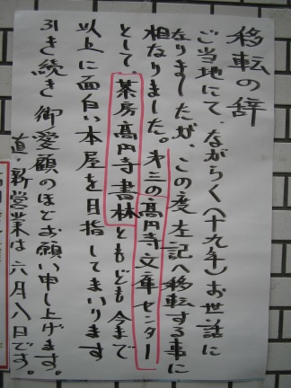 ものごっつい立ち読みでお世話になっていた高円寺文庫センターが、移転した。チェ・ゲバラTシャツや、怪しい草が店に並んでいた旧高円寺文庫センターは、19年も同じ店構えだったみたいだ。高円寺2年生のボクは存じ上げなかった。