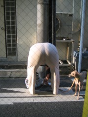 そんなこと思いながら、夕方から喫茶店で打ち合わせ。何気なく外を見ると、おばさんがかなりのインパクト体勢をとっておられた。思わず撮影してしまう。